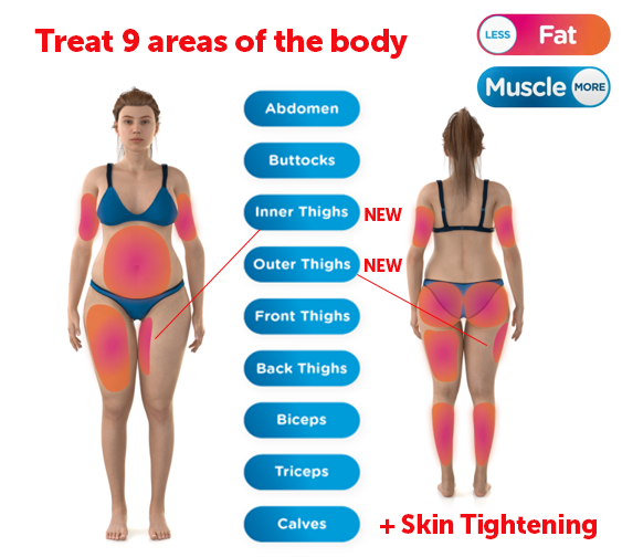 EMsculpt Neo with the new smaller applicators can now treat 9 areas of the body. These are the abdomen, buttocks, inner thighs, outer thighs (saddle bags), front thighs, back thighs, biceps, triceps and calves.
