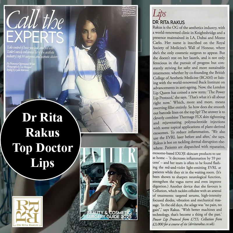 Dr. Rita Rakus is one of the UK’s most respected aesthetic doctors and has earned her reputation as the go-to expert for natural lip enhancement. With decades of experience and a long list of celebrity patients, she has been crowned Tatler’s Top Doctor for Lips for over 10 years running.