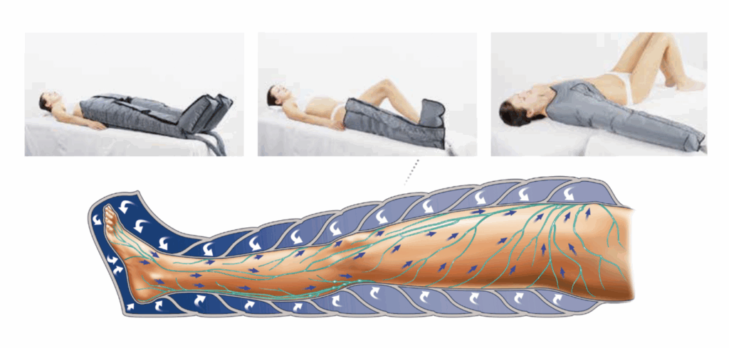 The treatment involves wearing a specially designed inflatable trousers — connected to a device that sequentially inflates and deflates compartments within the garment. This mimics natural muscle contractions, gently pushing lymph fluid through lymph vessels towards lymph nodes, where toxins and waste are filtered and removed. This process boosts the body’s detox pathways and reduces fluid buildup.