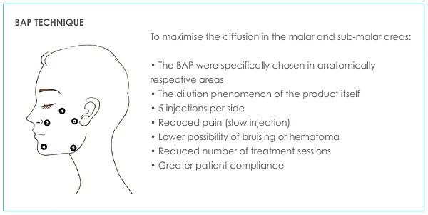 During treatment, tiny amounts of hyaluronic acid are injected just beneath the skin’s surface at precise points within the target area. For facial treatments, the BAP technique is used—five carefully mapped injection sites on each side of the face—ensuring optimal diffusion and even results. Once in the skin, Profhilo® gradually releases hyaluronic acid over 28 days, triggering the production of four different types of collagen and elastin. Over time, this process lifts, tightens, and deeply hydrates the skin, leaving it fresh, supple, and glowing.
