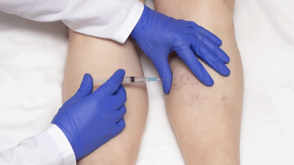 A fine needle injects the sclerosant solution into the affected veins, irritating the vein lining. This causes the vein walls to stick together and collapse, redirecting blood flow to healthier veins. Over weeks, the treated veins are absorbed by the body and fade from view.