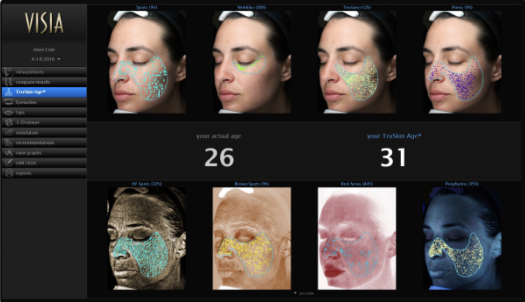 The VISIA system uses high-resolution 3D imaging combined with multi-spectral analysis to scan and evaluate multiple skin layers. During your appointment, your face will be gently positioned in front of the VISIA machine, which captures images in just a few minutes. The system then analyses various factors like: